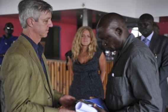 Assistant Secretary-General of the Department of Field Support Anthony Banbury presenting a United Nations flag to Delfino Abbas Alex, brother of the late Peter Kiko, during a memorial ceremony in Juba for the two UNMISS…