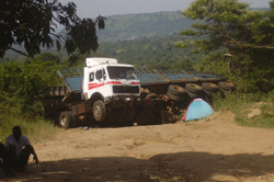 Standing at the side of one of the main roads leading to Juba, Haruna Apiligga gazed with dismay at the smashed beer crates, scattered water bottles and torn boxes of maize flour that had tumbled out of his overturned truck…